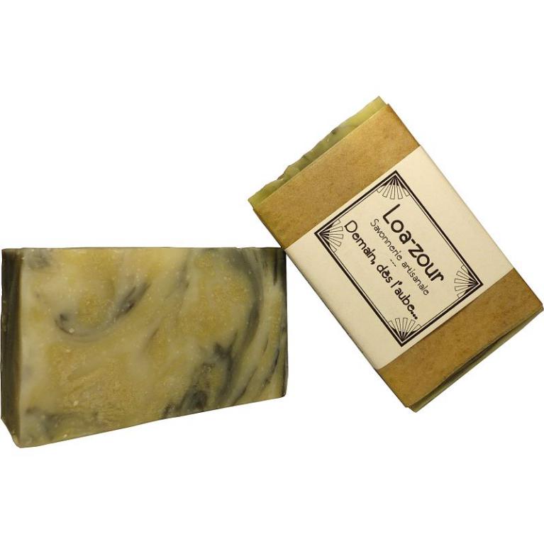 Je suis entièrement fabriqué à partir d’huile d’olive, parfumé aux huiles essentielles de lavandin, thym et lavande et coloré à l’argile verte et au charbon végétal.